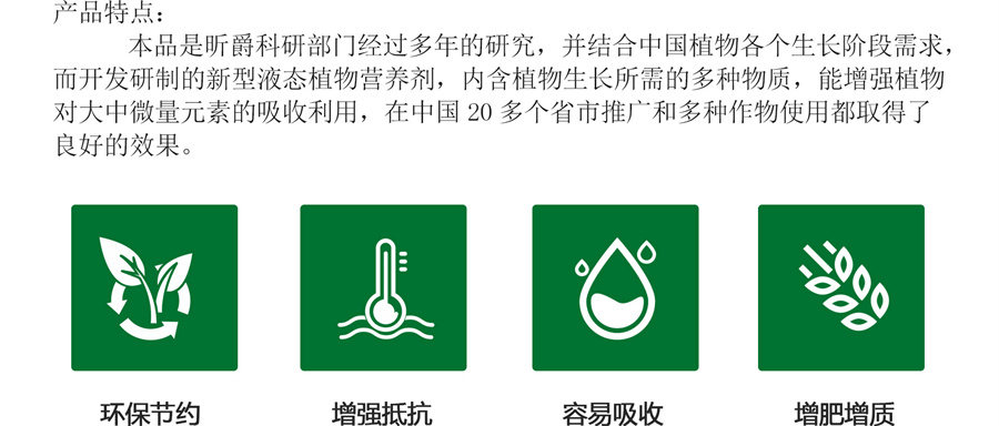 本品是昕爵科研部门经过多年的研究,并结合中国植物各个生长阶段需求,而开发研制的新型液态植物营养剂,内含植物生长所需的多种物质,能增强植物对大中微量元素的吸收利用,在中国20多个省市推广和多种作物使用都取得了良好的效果。
