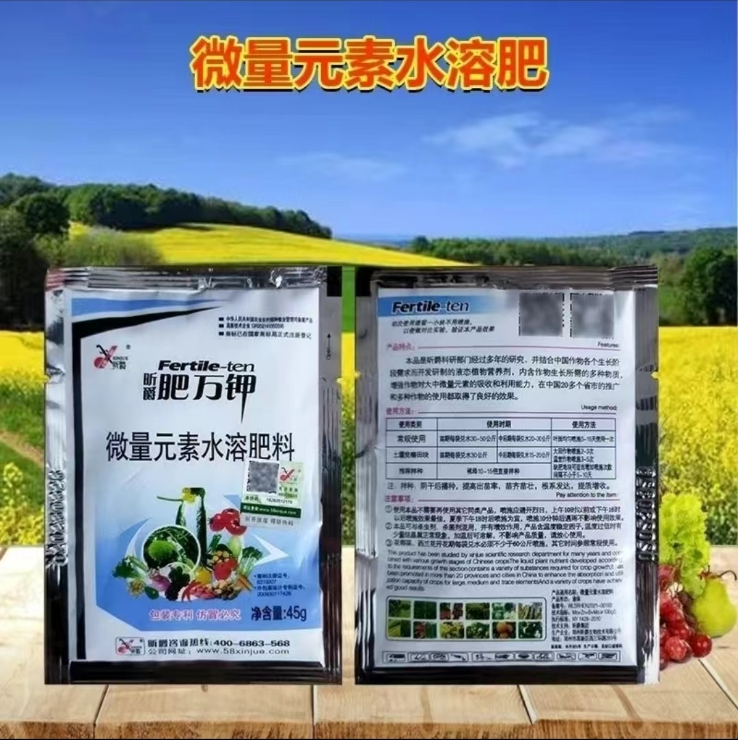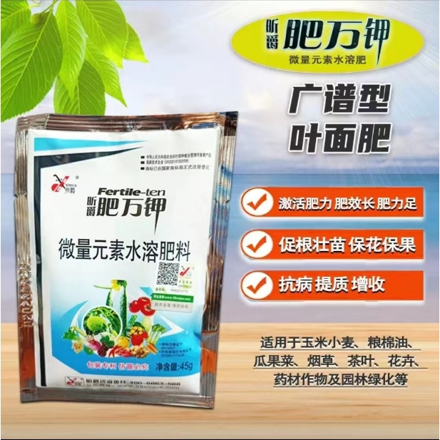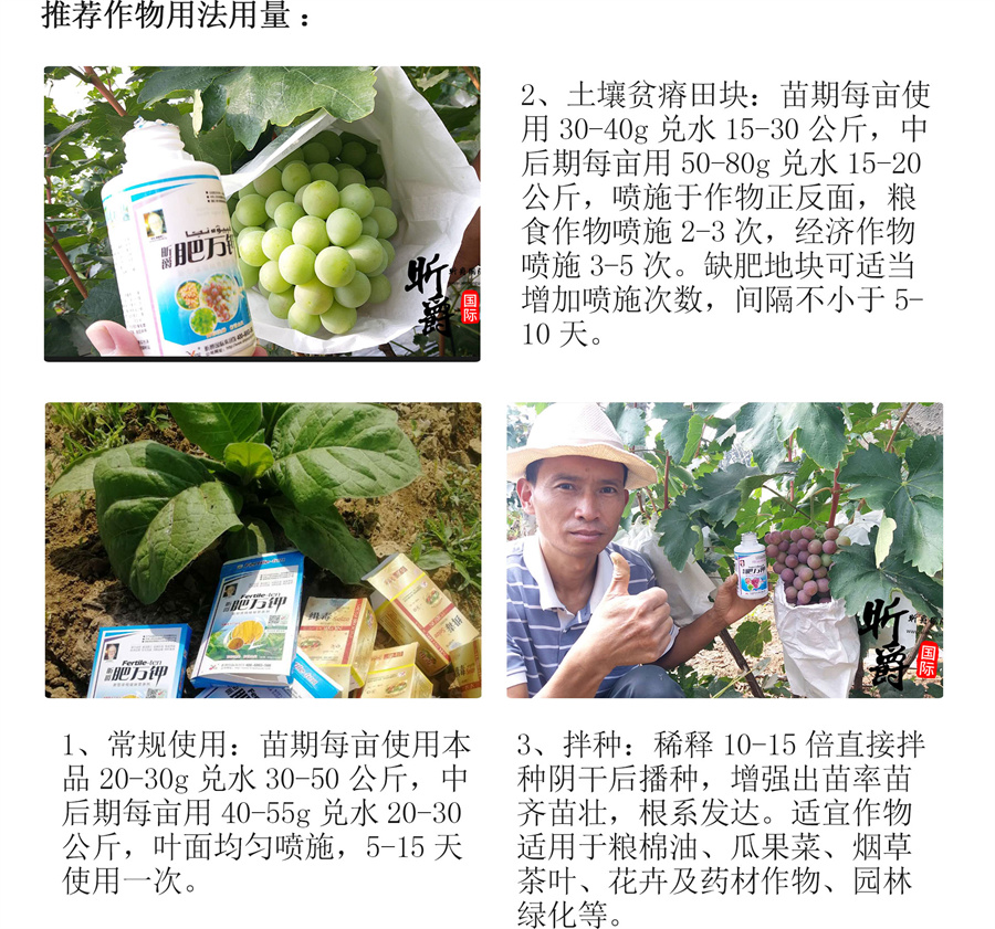 2、土壤贫瘠田块:苗期每亩使用30-40g兑水15-30公斤,中后期每亩用50-80g兑水15-20公斤,喷施于作物正反面,粮食作物喷施2-3次,经济作物喷施3-5次。缺肥地块可适当增加喷施次数,间隔不小于5-10天。