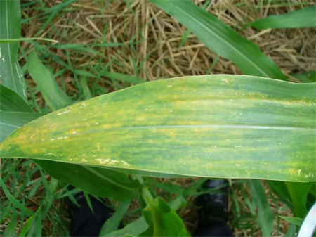 玉米5~8片叶期,土壤肥力不够,玉米叶色变黄,出现脱肥现象,玉米抗病性降低,是发生褐斑病的主要原因。