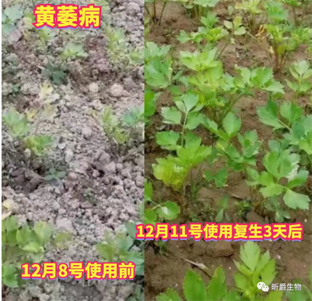 图5:广西岑溪代理商钟文佳反馈:,芹菜黄萎病严重,使用复生后3天就看出来非常明显的效果,芹菜开始恢复生长,第7天观察看不到任何病害,而且促进芹菜长势很好!