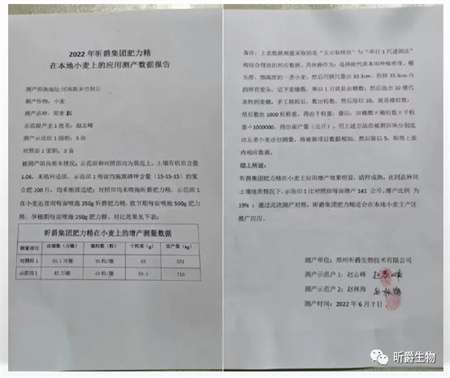 河南新乡封丘,户主赵志峰,用了昕爵淝力精,比没用淝力精的小麦亩增产282斤,亩增收价值282*1.55=437.1元(按当时的麦价计算)